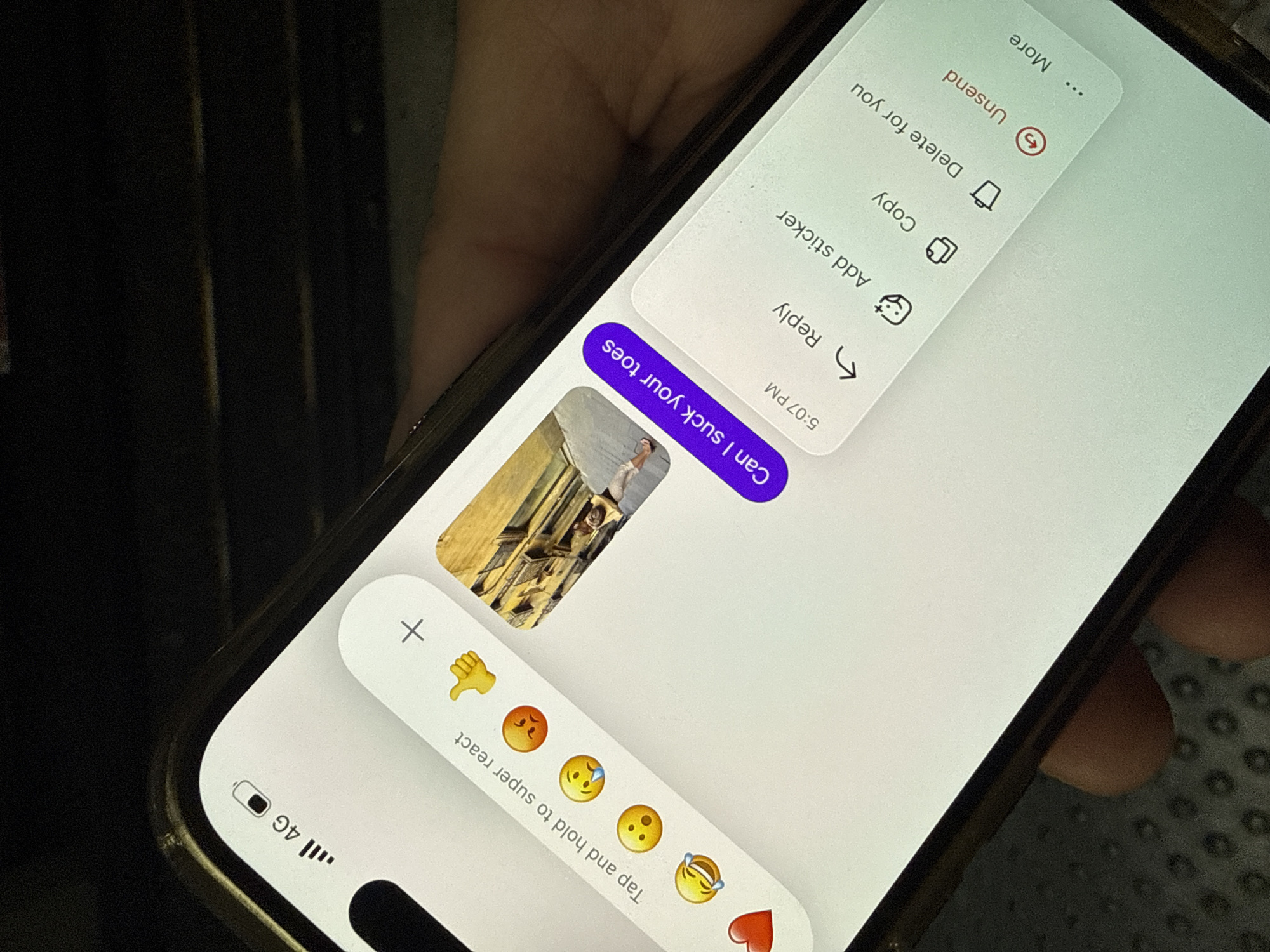 The image displays a close-up, oblique view of a smartphone screen, likely an iPhone, held by an individual's hand against a dark, textured background consistent with the interior of a public transport vehicle within the city of Milan, Italy. The phone's status bar indicates a strong 4G cellular signal and a full battery charge. The screen presents a messaging application interface. Visible are reaction options, including a heart, laughing emoji, dizzy face, drooling face, angry face, and thumbs-up, accompanied by the text "Tap and hold to super react." A message bubble contains an image depicting human bare feet with a yellow-toned, possibly architectural, background. Below this, a purple message bubble reads "Can I suck your toes," timestamped "5:07 PM." A contextual menu is overlaid on this message, presenting options such as "Reply," "Add sticker," "Copy," "Delete for you," "Unsend" (highlighted in red), and "More."