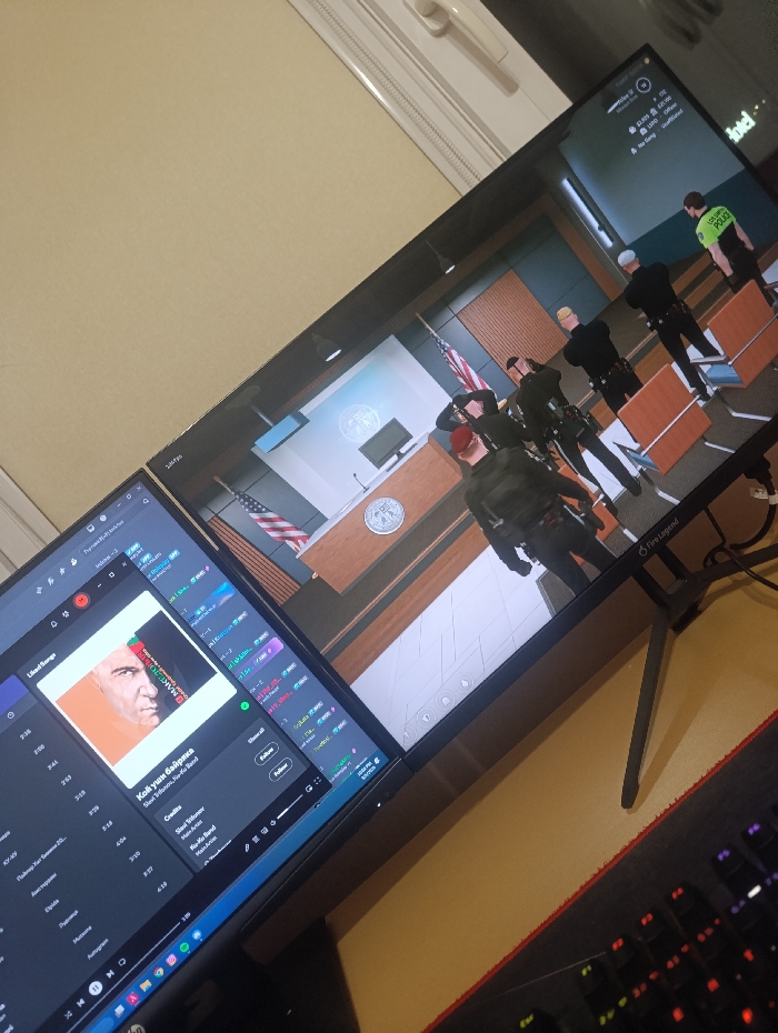 The scene depicts a dual-monitor computer setup in an indoor environment, presumed to be in Stara Zagora, Bulgaria. The image is captured from an elevated, angled perspective. The left monitor displays the Spotify music application interface. An album cover occupies a central position, featuring a close-up of a man's face against an orange backdrop, with Bulgarian text 'Който има бащина' and 'Стоян Трифонов' identifying the track and artist. A playlist or song list is visible below, alongside standard media playback controls. The right monitor displays a video game or simulation set within a virtual courtroom. Several human figures, rendered as characters, are visible. The characters include individuals dressed as law enforcement officers, some in tactical gear with helmets, and one in a light-green uniform vest bearing "LOS SANTOS POLICE" text. These figures stand in the foreground and mid-ground of the courtroom. In the background, a judge's bench or similar raised platform with a circular seal is visible, flanked by an American flag on a stand to the left. The monitor's bottom bezel displays "FireLegend" branding. Behind the monitors, a light-colored wall is visible, with a white window frame and handle discernible in the upper section of the image. In the foreground, on a light-colored desk surface, a portion of a black mechanical keyboard with red-accented RGB backlighting and a red-edged mousepad are present, indicating a user's workstation. Cables are minimally visible behind the right monitor. No actual human figures are physically present within the depicted room.