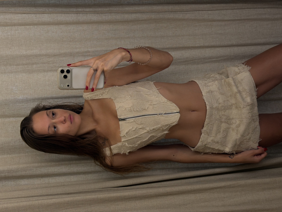 A fair-skinned woman holds her smartphone to take a selfie in front of a neutral curtain backdrop. She's wearing a beige, frayed-edge two-piece outfit: a cropped top with a visible zipper and a matching mini skirt. The woman has long brown hair and a neutral expression. Red nail polish contrasts with her light complexion and clothing. A bracelet adorns one wrist. The phone occupies a significant portion of the frame, while the subject is rotated.