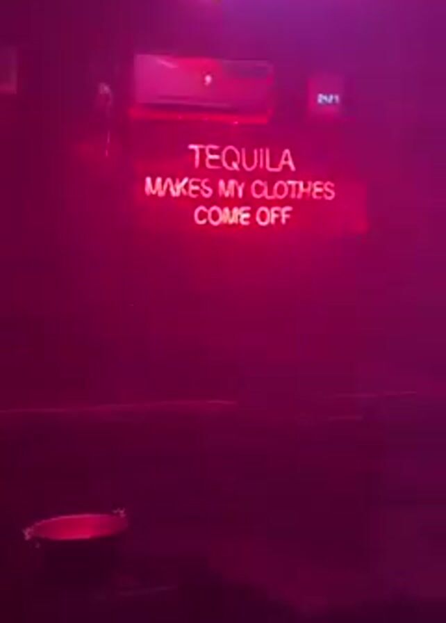 interior of a bar or club with red and pink neon lighting. There is a neon sign that reads "TEQUILA MAKES MY CLOTHES COME OFF." The room is dimly lit and appears to have a dark couch, chairs, and tables. An air conditioning unit is also visible. The lighting changes between red and pink, creating a vibrant atmosphere. A digital clock displays 04:27. Music plays in the background.
