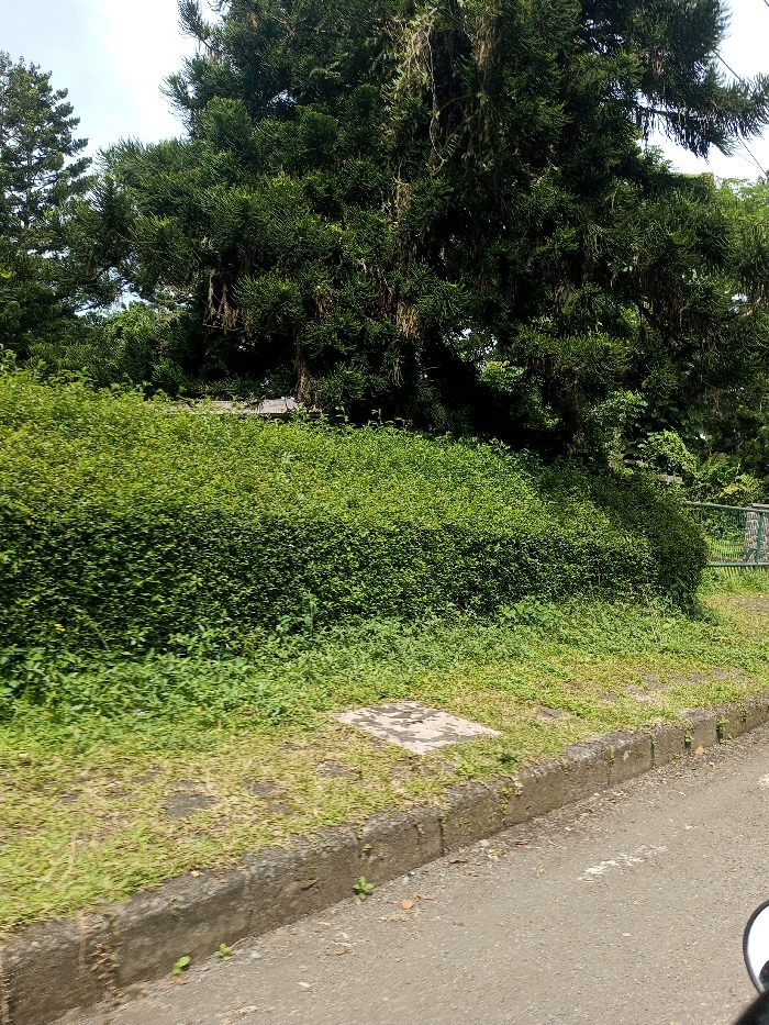 The image depicts an outdoor scene in the city of Namthoung, Laos, characterized by dense vegetation and a roadside. The foreground shows an asphalt road surface on the right, leading to a concrete curb that delineates a narrow strip of mixed grass and dirt. Embedded within this strip is a single square, light-colored concrete or stone slab. In the bottom right corner, a partial view of a white, reflective object, possibly a vehicle mirror, is visible. Behind the grass strip, a dense, manicured green hedge extends horizontally across the midground. The background is dominated by a massive, dark green coniferous tree featuring abundant foliage and visible strands of moss or epiphytes hanging from its branches. Another taller coniferous tree is partially visible to the left. Behind the hedge and beneath the primary tree's canopy, a light-colored structural element, possibly a roof or building facade, can be seen. To the far right, a green metal fence or railing is visible through gaps in the vegetation. The sky is bright overhead. No individuals or active subjects are present.