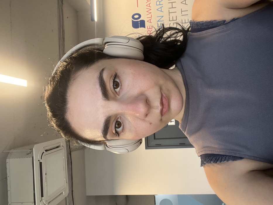 The image displays a close-up, frontal portrait of an adult female, centrally positioned. She has dark hair pulled back, dark brown eyes, and prominent eyebrows. Her skin is fair, exhibiting a slight redness on the bridge of her nose and cheeks, and a small dark mole on her left cheek. She wears light beige over-ear headphones and a dark grey or slate blue ribbed sleeveless top with ruffled detailing on the shoulder straps. The background is an indoor, modern commercial or public space. The ceiling, visible in the upper portion, appears to be an exposed concrete or painted slab with a white rectangular cassette-style air conditioning unit mounted in the upper left. Two elongated, bright linear light fixtures are also visible on the ceiling. The left background consists of a plain light-colored wall, partially revealing a dark-colored door frame. The right background features a white wall with a large, multicolored graphic. A blue graphic resembling a toilet paper roll is visible, along with fragmented English text in blue and red. Partially visible words include "ARE ALWAY," "REN ARE," "GETHE," and "KE IT A," suggesting a theme related to hygiene or restroom facilities. The scene is located within a contemporary interior, such as an office, gym, or public building in Sofia, Bulgaria. The exact location within the city cannot be precisely determined from the visual information provided; however, the background graphics indicate proximity to a restroom or a focus on sanitation.