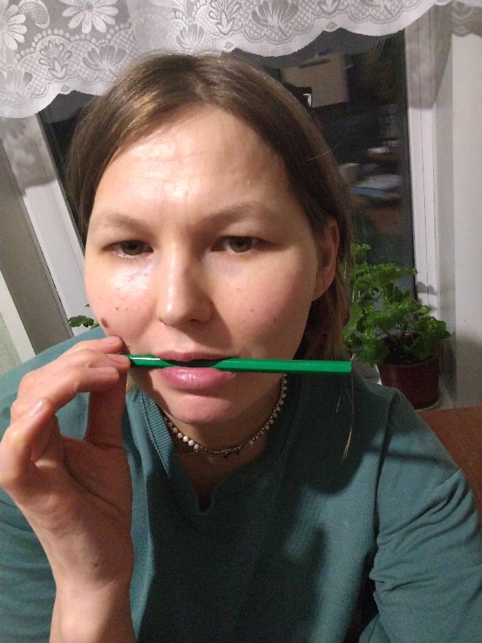 A female subject with light brown hair and a fair complexion is depicted in a close-up, centered on her face and upper torso, within an indoor environment in the city of Дойная, Russia. She wears a teal long-sleeved top and a multi-strand necklace, one strand featuring small white beads. Her gaze is directed towards the camera. A bright green cylindrical object, consistent with a pen or pencil, is held horizontally between her lips. Her left hand is positioned beneath the object, with fingers curled around its left end. The background includes a white lace curtain with a floral pattern along the top edge of the frame. To the subject's right, a window reveals a dark exterior, suggesting nighttime or a dimly lit outdoor scene, with a potted plant displaying green foliage on an apparent windowsill. A wooden surface is partially visible in the lower right portion of the frame.