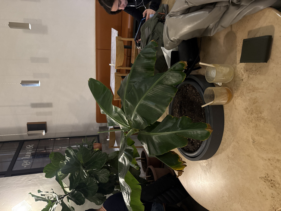 The image presents an indoor scene within a cafe identified by the mirrored text "Sighnaghi" on a window, located in Yerevan, Armenia. A prominent, large potted banana plant with broad green leaves, some exhibiting browning at the tips, is centrally positioned on a round, light-colored, speckled table. To the right of the plant, two ribbed glass tumblers are visible; one contains an amber liquid with a white straw, and the other is mostly empty with a similar straw. A black rectangular object, possibly a wallet or small notebook, lies on the table further right. A beige puffy jacket is draped over an unseen chair or bag on the far right. A young female, with dark curly hair and wearing a black long-sleeved top and white earphones, is seated on the right, engrossed in a smartphone held in both hands. A dark green jacket or bag is placed on the table next to her. The left side of the frame shows a partial view of another individual, seated behind a large potted fiddle-leaf fig plant. The background features a white wall with a continuous brown upholstered bench seat lining it. Several light-colored tables with wooden chairs are arranged in front of the bench. Three cylindrical pendant lights hang from the ceiling, casting distinct shadows on the wall. A large window on the left side of the room provides a view outwards or reflects the interior. Multiple other potted plants are distributed throughout the space. The lighting is ambient, creating a subdued atmosphere.
