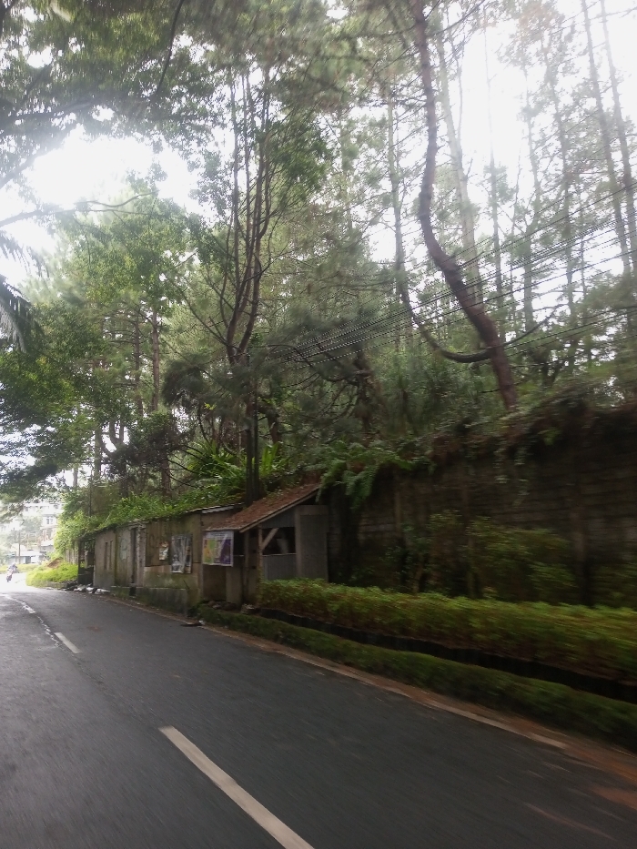 The image depicts a roadside scene in Babaliya Mal., India, characterized by a paved two-lane road with a single solid white line, running diagonally from the bottom-center towards the upper-left. The road surface appears damp. On the right, a low, weathered wall supports several small, basic structures with corrugated roofs; one features a window and doorway, while others display faded posters. Dense vegetation, including numerous tall conifer-like trees and broadleaf trees, forms a canopy overhead and covers the area behind and on top of the wall, with ferns and bushes growing prominently. Multiple black power lines are strung across the upper-middle section of the frame, passing through the tree canopy. In the far distance on the left side of the road, a blurry figure on a two-wheeled vehicle is faintly visible, moving away from the viewer. Partial views of multi-story buildings are discernible through the foliage on the upper-left. The lighting is diffused, indicating an overcast day.
