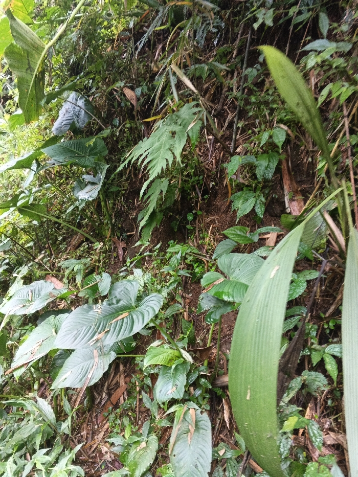 The image displays a dense, natural vegetative scene located in Situm, Papua New Guinea. The environment consists of lush, predominantly green tropical foliage covering an uneven, possibly sloped, earthen surface. Numerous plant species are present, including several large, dark green, heart-shaped leaves (likely from aroid plants) positioned in the lower-left and mid-center of the frame. A distinct fern with deeply serrated fronds is visible in the mid-left to upper-center. On the far right, a long, light green, vertically oriented strap-like leaf extends upwards. The ground and lower sections are covered by smaller green plants, interspersed with visible patches of dark soil, brown organic debris, and thin, dry woody stems. No human individuals, animals, or man-made objects are discernible within the frame. Natural daylight illuminates the scene, suggesting an outdoor, forested, or jungle-like setting.