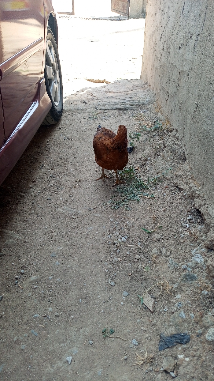- "The scene in Lugbe, Nigeria, depicts a medium-brown chicken standing on a compacted dirt and gravel path" by FM-RIWQ12, licensed under CC BY 4.0