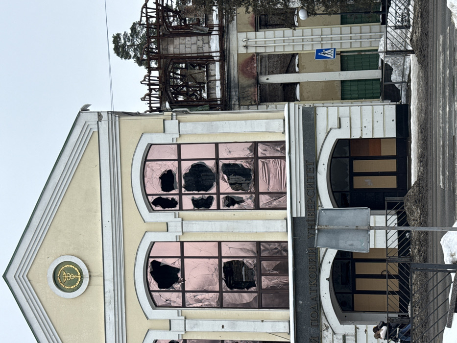 The image depicts severe damage to the National Tax University in Irpin, Ukraine, under an overcast sky