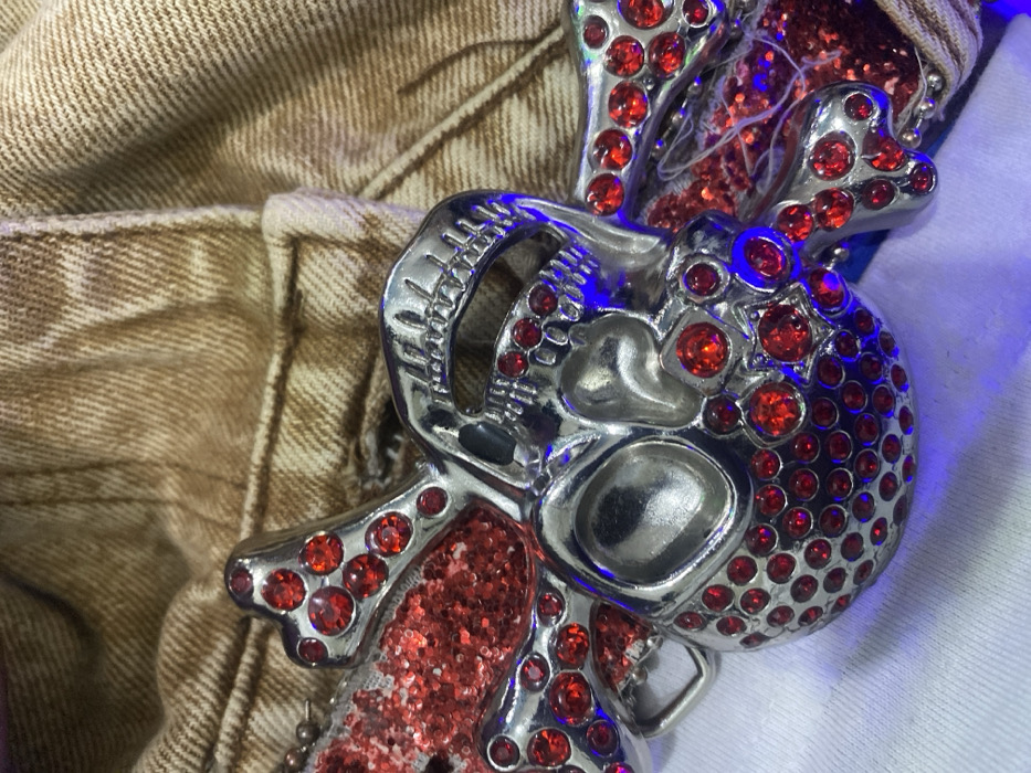 A close-up image depicts a shiny, silver-colored metal belt buckle shaped like a skull and crossbones