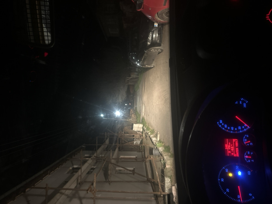 The image captures a static, nighttime street scene viewed from the driver's seat of a stationary vehicle, identified as being in Kasnakovo, Bulgaria. The vehicle's dashboard occupies the lower portion of the frame, displaying an instrument cluster with a digital readout indicating 2:49, an ambient temperature of -0.0°C, an odometer reading of 209,704 km, and a trip meter of 106.7 km. The speedometer and tachometer needles are at zero, and blue low beam and yellow indicator lights are illuminated. Beyond the windshield, the vehicle's headlights illuminate a narrow, unpaved or poorly maintained road that recedes into the dark. On the left, a multi-story building undergoing construction or renovation is enveloped in scaffolding consisting of metal poles and wooden planks. Overhead utility lines are visible against the night sky above this structure. A concrete curb and sparse vegetation line the road, with a white bucket resting near the scaffolding. On the right side of the road, a dark-colored sedan with a Bulgarian license plate is parked, followed by a red compact car. Further down the street on the right, a residential structure is partially visible behind trees or dense bushes. A streetlamp in the middle distance casts additional light onto the scene.