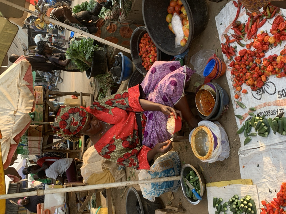 A woman in colorful clothing sits at a market stall. She wears a red and green patterned top and purple skirt. She is preparing food, with a bowl of rice in her hands. Around her are baskets and bowls of produce: tomatoes, greens, chili peppers, and okra. Some okra is cut. The stall has a weathered cloth with numbers printed on it as a backdrop. Other vendors and their stalls are seen in the background, indicating a bustling market scene.