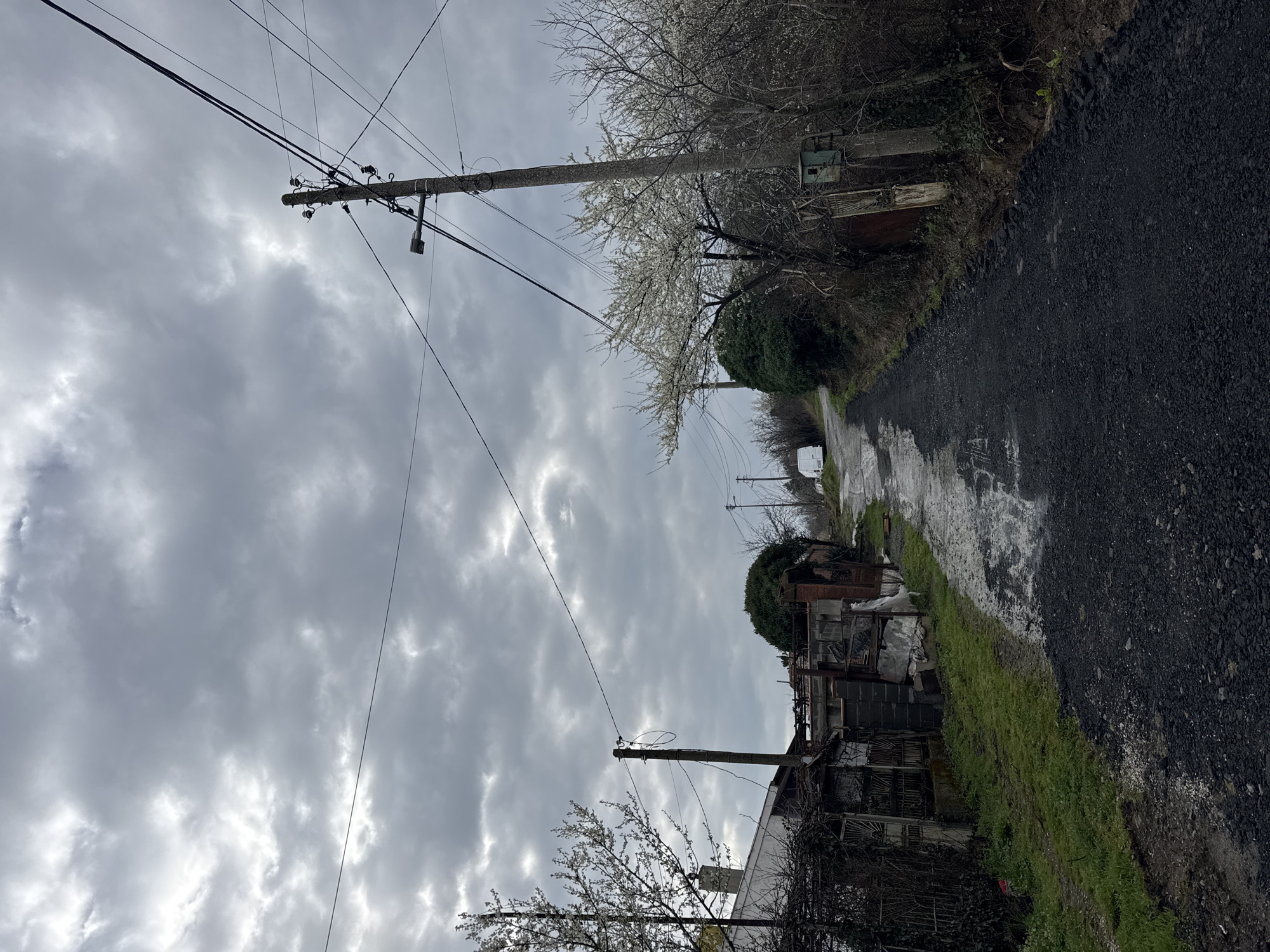 narrow, slightly wet asphalt road in Atiya, Bulgaria. On either side of the road are weathered structures, including what appears to be dilapidated buildings and fences. Utility poles run along the road, with overhead wires extending across the sky. The sky is overcast with grey clouds. Vegetation includes trees with white blossoms and grassy areas along the roadside. The scene appears to be a rural or less developed area. No people are visible in the image.