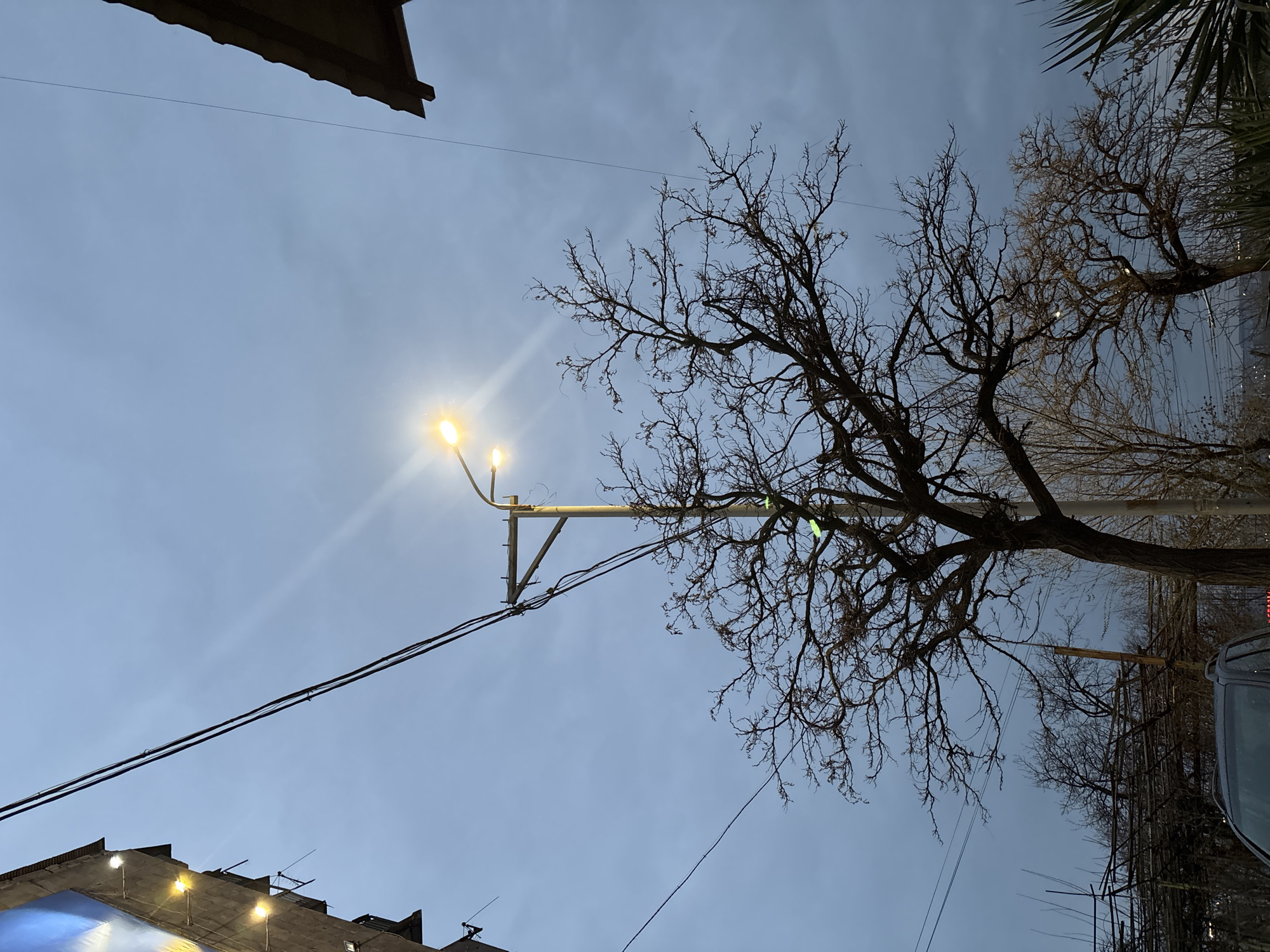 An upward-angled view shows a street scene in Yerevan, Armenia. In the foreground, a leafless tree dominates the right side of the frame, its branches reaching towards the sky. A street light with two illuminated lamps is on the left, contrasting with the bare branches. Electrical wires run across the sky. Below, fragments of buildings are visible: a roof edge with lights and antenna. A partial view of a vehicle appears on the right edge. The sky is a muted blue color.