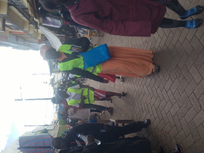 Several people are walking along a brick-paved path. Some wear bright yellow vests, while one person sports a blue bag and an orange skirt. Buildings line the background. The picture seems taken at an angle, presenting a slightly skewed perspective of the scene.