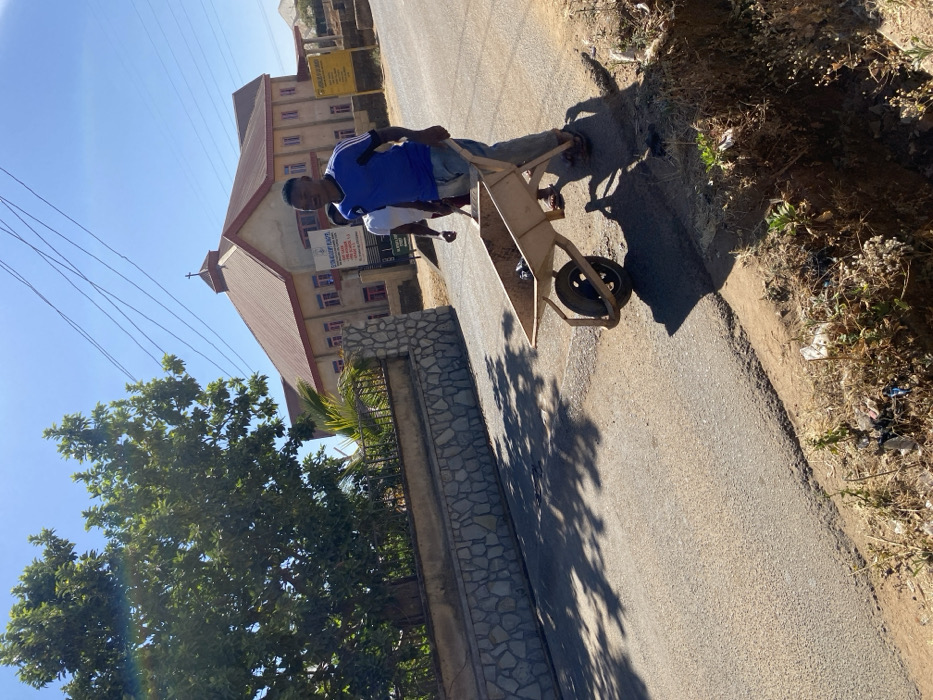 The image depicts an outdoor scene in Barakin Akawo, Nigeria, under a clear blue sky with direct sunlight casting distinct shadows. On the right side of an asphalt road, a male individual of dark complexion is pushing a tan-colored single-wheel wheelbarrow forward. He wears a blue short-sleeved t-shirt with black stripes on the shoulders, light-colored long pants, and sandals. The wheelbarrow's basin contains dark, amorphous material. A second male, wearing a white t-shirt, is partially visible directly behind the first individual and the wheelbarrow. To the left of the road, a low wall constructed of irregularly shaped, greyish stones runs parallel to the road, topped with a black metal railing. Behind this wall, a large, dense green tree with abundant foliage is prominent. In the background, a multi-story building with a reddish-brown corrugated metal roof and a central spire crowned by a cross is visible. The building's walls are light-colored, and it features multiple windows with red frames. A sign attached to the building's facade partially reads "ETERNAL GOSPEL MINISTRY GLOBAL WORLDWIDE...". Multiple black utility lines are stretched across the sky above the building and tree. The immediate foreground on the right consists of a dirt embankment with dry grass, various small plants, and scattered litter. The asphalt road surface exhibits signs of wear.