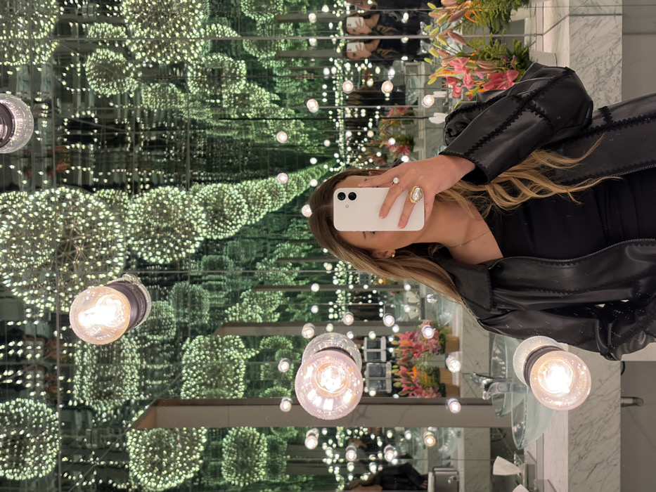 A woman in a black leather jacket takes a selfie in a mirrored room. Countless spherical light fixtures create an illusion of an endless expanse. The reflections distort and multiply, blurring the boundaries of space. Pink flowers are visible in one of the mirrors. The woman holds a white smartphone, capturing the spectacle.