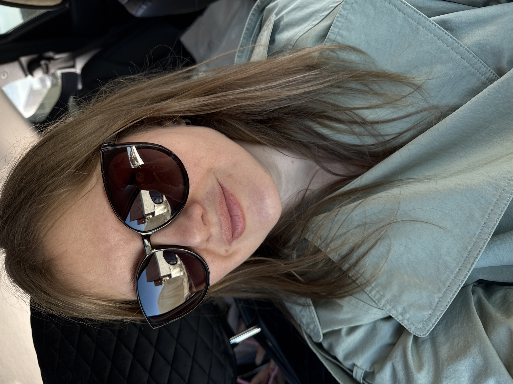 A female individual is depicted in a close-up portrait inside a vehicle, located in the city of Горный, Russia. She has light brown hair and is wearing dark, cat-eye style sunglasses. Her lips are closed in a slight smile. She is dressed in a light sage-green trench coat with visible collar and lapels. Small, gold-colored hoop earrings are visible. Behind her to the left, dark, diamond-quilted seat upholstery is present. Blurred elements of the car interior, including a light-colored headliner and a seatbelt mechanism, are visible to her right. The reflective lenses of her sunglasses show an outdoor scene under a clear blue sky. This reflected environment includes several white or light-colored buildings with distinct reddish-brown pitched roofs, consistent with residential or similar structures. One visible structure in the reflection appears partially covered by a light-colored tarp or material. The lighting indicates a daytime setting.
