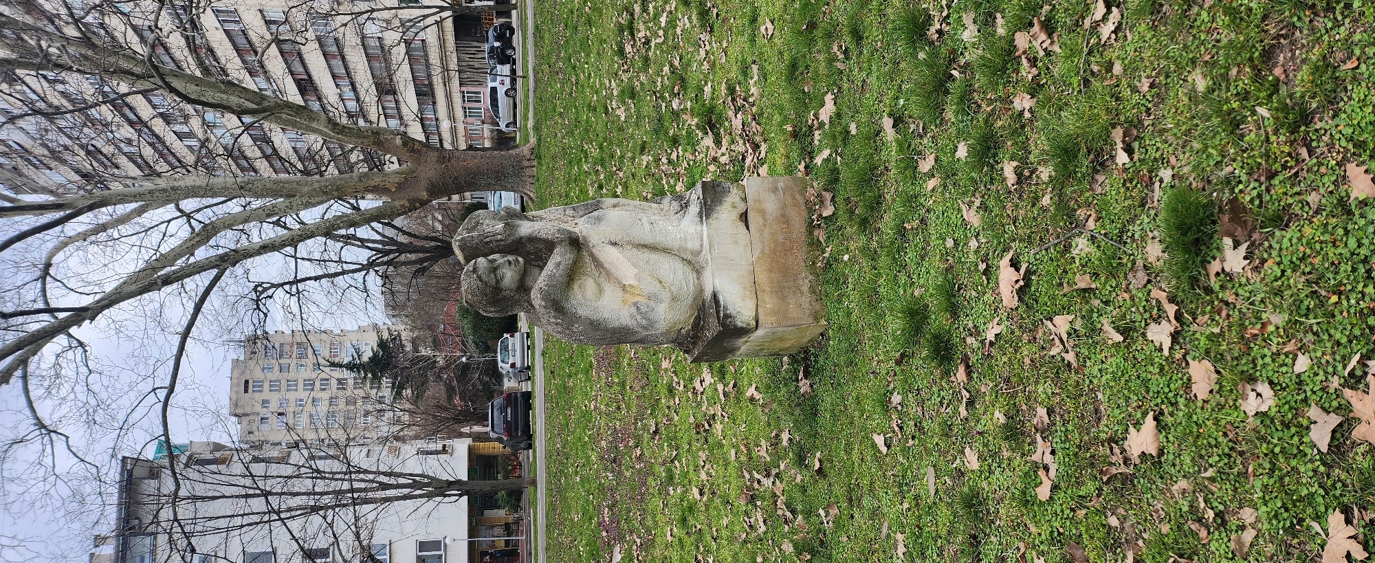 The image displays a weathered stone sculpture of two intertwined human figures in a seated embrace, situated on a rectangular stone pedestal within a grassy urban green space in Ruse, Bulgaria. The sculpture shows signs of discoloration and erosion. The ground is covered with green grass and numerous scattered brown, dried deciduous leaves. Behind the sculpture, several large, bare-branched deciduous trees, including a prominent plane tree with light, mottled bark, stand against an overcast grey sky. A paved road runs parallel to the green space, where a dark SUV with a Bulgarian license plate (beginning with 'P') and a light-colored hatchback are parked. In the background, multiple multi-story urban buildings are visible: a white structure with ground-floor commercial premises on the left, and taller residential apartment blocks to the right and center, featuring numerous windows. The scene is consistent with a winter or early spring setting due to the bare trees.