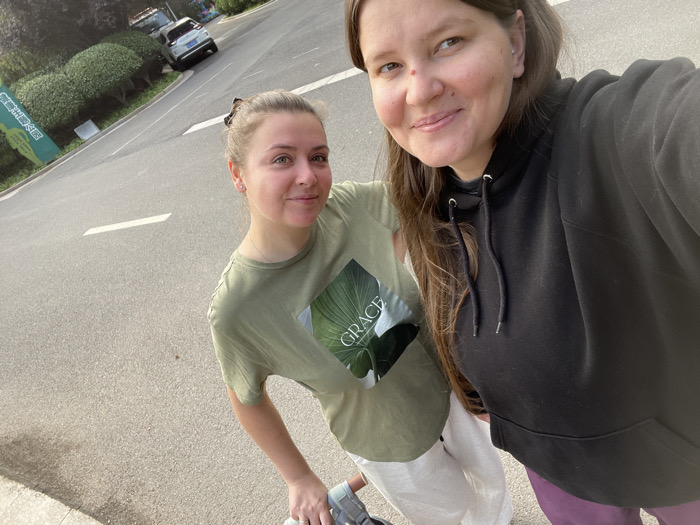 Two adult females are positioned for a photograph on a paved road in Zhongyuan District, China