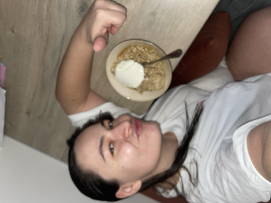 A person poses with a flexed arm and a slightly pouted expression. A bowl of oatmeal topped with yogurt and a spoon rests on a table near the person. The person wears a white shirt. The background features a pillow and what appears to be a wall or other surface.