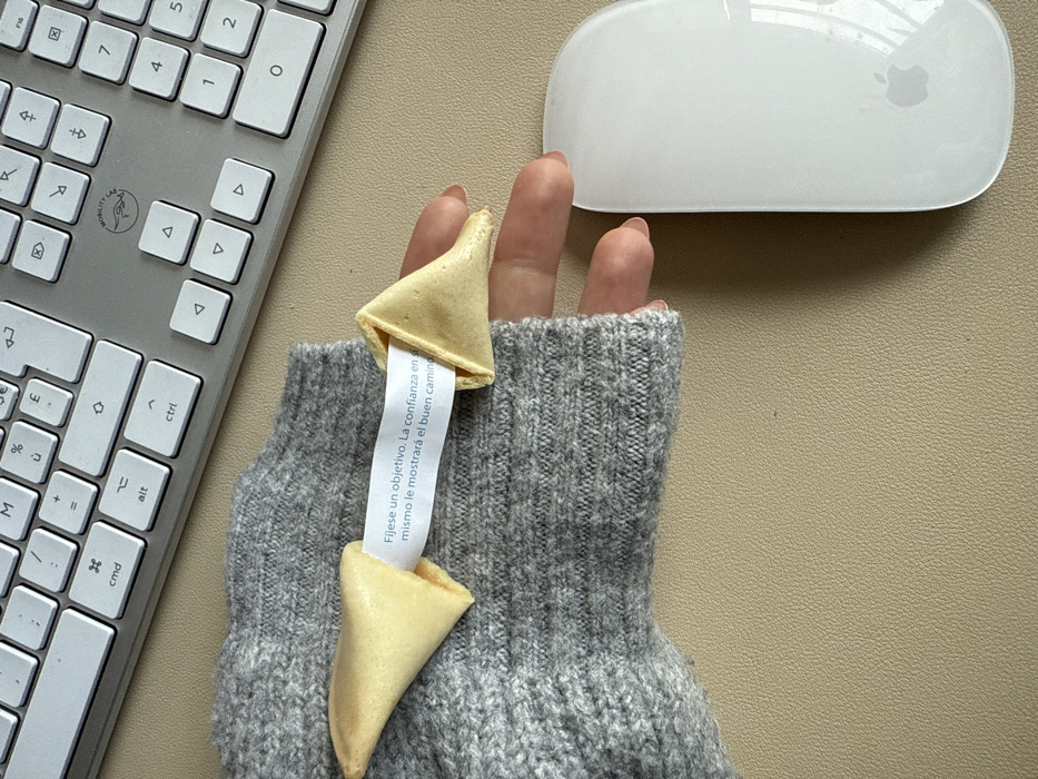 The image depicts an overhead view of a person's left hand and forearm on a light beige desk surface, likely in an office or home office setting. The person's forearm is covered by a grey, knitted sweater. The hand is holding an open fortune cookie, from which a white paper fortune has been partially extracted. The visible text on the fortune, written in Spanish, reads: "Fíjese un objetivo. La confianza en sí mismo le mostrará el buen camino." This translates to: "Set a goal. Self-confidence will show you the right path." To the right of the hand, a white Apple Magic Mouse is present, displaying the Apple logo. In the background, a silver Apple wireless keyboard is visible, showing parts of its alphanumeric and numeric keypad section.