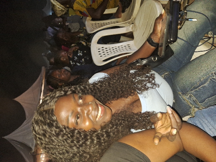 A woman with dark skin and curly hair smiles at the camera. She wears a light blue shirt and sits among other people. Some individuals are seated in white plastic chairs. The woman's left hand is partially visible near her face. In the background, others are seated or lying down, and there is some visible clothing and what seems to be a tent-like structure. The setting appears to be casual, possibly outdoors during an event or gathering.