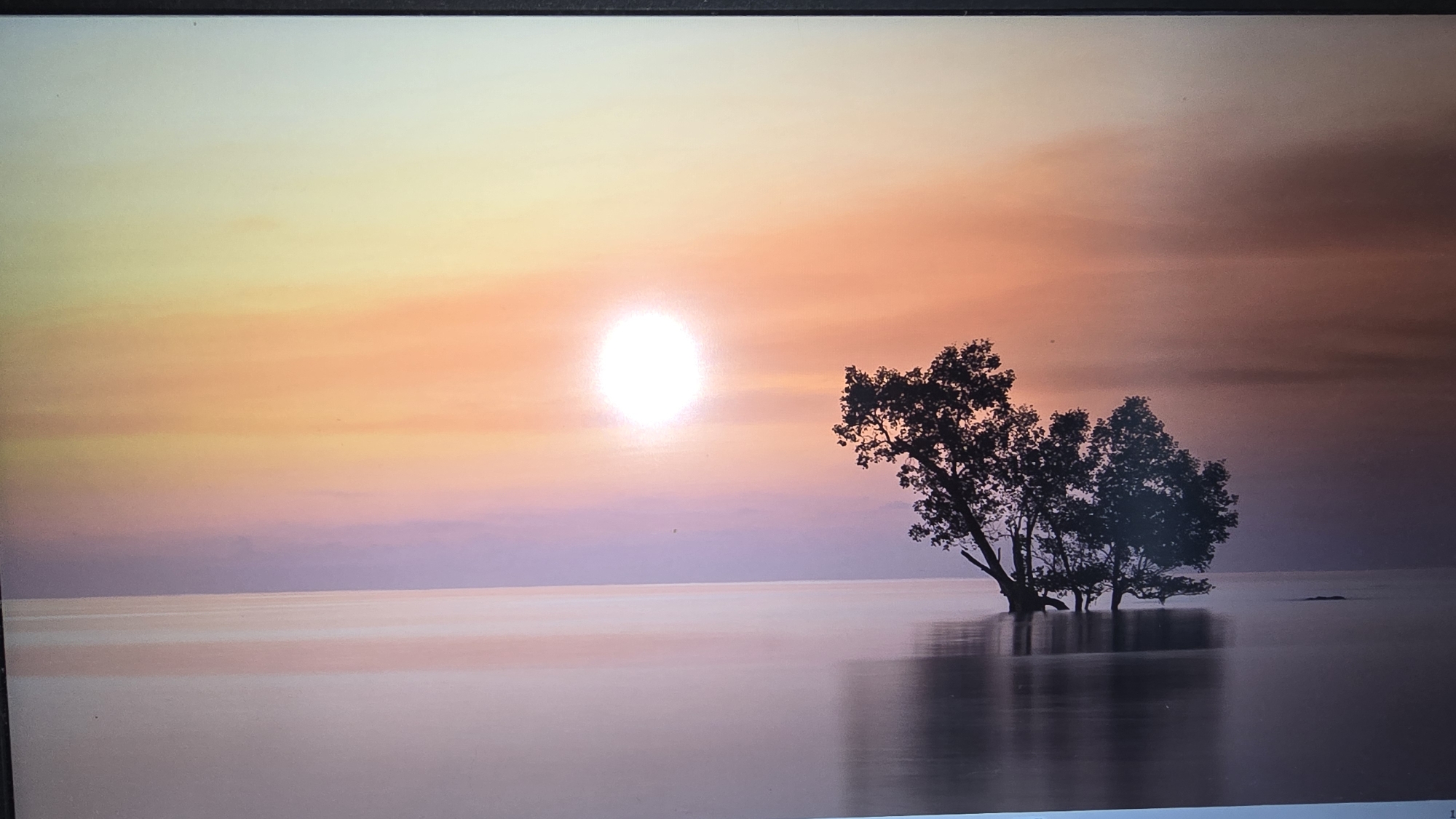 A serene water landscape is depicted at sunset or sunrise, located in the city of Helmond, Netherlands. The sky displays a horizontal gradient of colors, ranging from light yellow at the upper left, transitioning to orange-pink across the horizon line, and darkening to purple and violet towards the upper right. A brilliant, circular white sun is prominently positioned in the upper-left quadrant of the sky, emitting a strong light. A cluster of dark-foliaged trees stands partially submerged in the water in the right midground, their lower trunks and roots obscured. The trees cast elongated, slightly blurred reflections onto the exceptionally smooth, still water surface, which mirrors the sky's soft hues. A smaller, indistinct dark object is partially visible above the water further to the right. No individuals or active subjects are present in the scene.