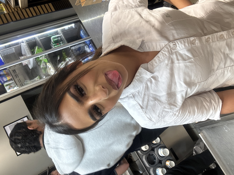 The image portrays an indoor scene, likely within a commercial food service establishment. In the foreground, a female with dark hair, a medium complexion, and prominent false eyelashes looks directly forward with her tongue extended. She is wearing a light-colored, short-sleeved collared shirt with visible buttons down the front and a small dark emblem on the left chest area. Behind her to the left, another individual, appearing male, is seen from the back, wearing a light grey hooded sweatshirt and possessing dark hair styled in twists or braids. Below this individual, a stainless steel counter area features a dispenser holding multiple white and light blue paper cups. To the right of the foreground female, a large, glass-fronted commercial refrigerator displays various packaged food items, green beverage cans, and produce. A brown paper bag rests on a brushed metal counter surface to the right of the refrigerator. The background includes a light-colored wall above the refrigerator and a darker section below. The image does not contain identifiable markers to specify a location within Erstein, France.