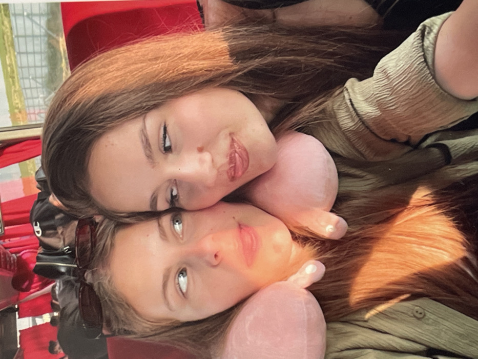 The image displays two young adult females seated within a vehicle, identifiable by visible red seat upholstery and a window in the upper right