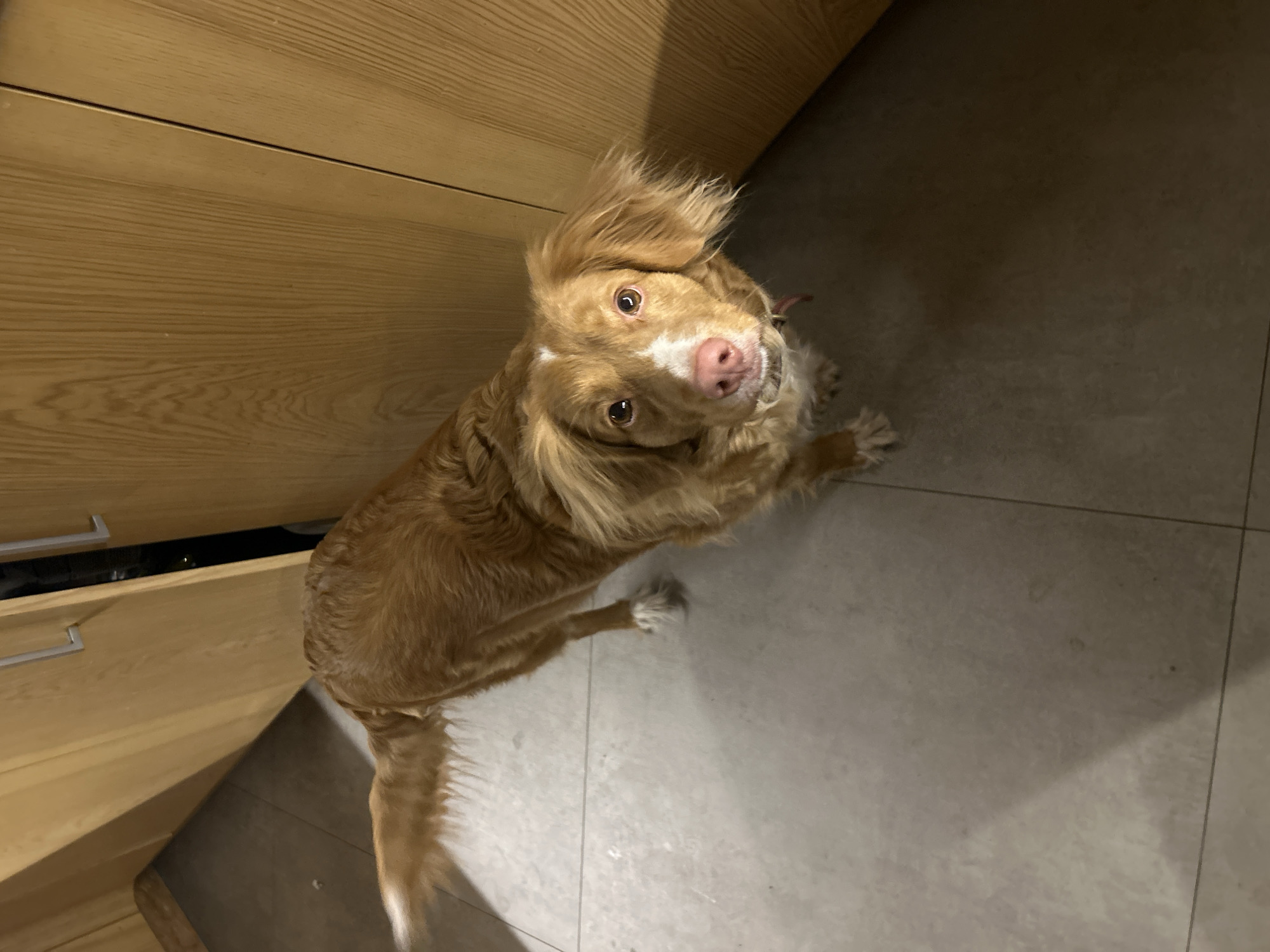A medium-sized, tan-colored dog with long, wavy hair and a white patch on its face stands on a gray tiled floor and looks up at the camera. The dog appears to be indoors, positioned near a wooden cabinet with visible drawer pulls. The dog's tail is wagging slightly. The setting is domestic, and there's no specific evidence to suggest the location is Riga, Latvia.