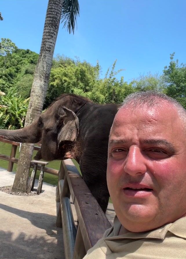 man taking a selfie with an elephant. The man is wearing a tan polo shirt and standing in front of a wooden fence. The elephant is behind the fence, near a small body of water, and is brown in color. There is a palm tree to the left of the man and the elephant. The sky is blue and there are green trees in the background.
