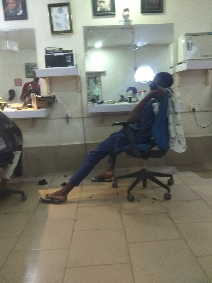 Inside a barbershop, a dark-skinned person wearing a blue shirt and pants sits in a blue office chair, legs extended with one foot resting on the ground in a black sandal