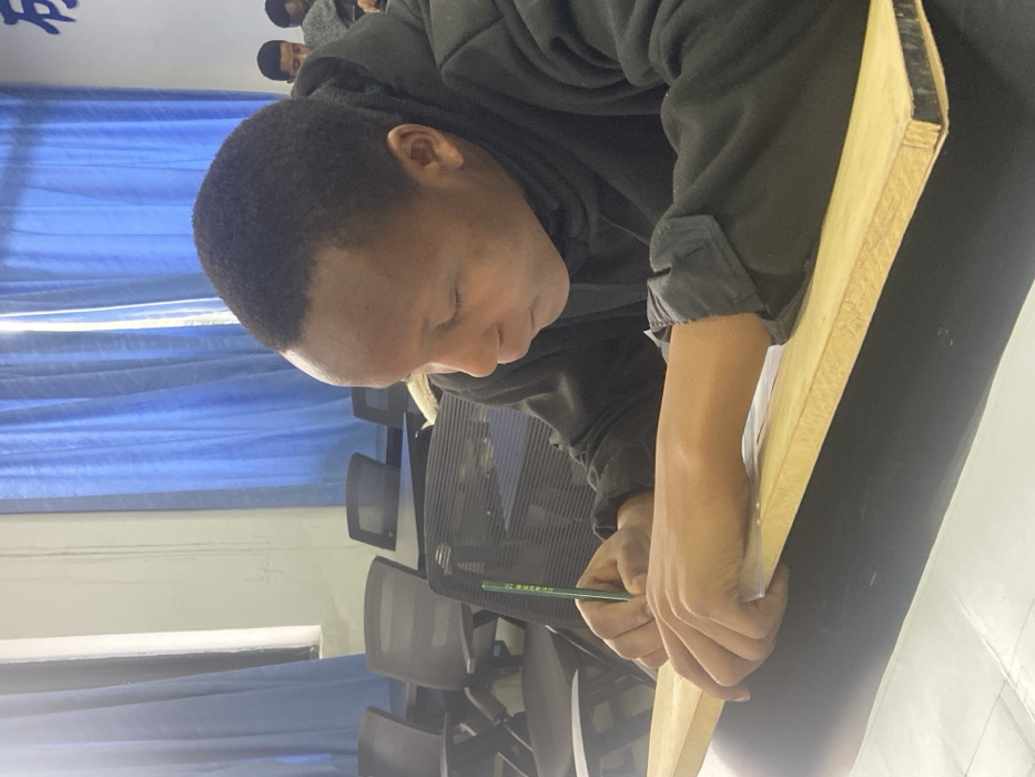 A person with short, dark hair, wearing a dark hooded sweatshirt, is hunched over, intently focused on writing on a piece of paper placed on a wooden board. They are holding a green pencil in their right hand. A row of chairs is visible in the background, along with a blue curtain. Other people are visible in the upper portion of the frame. The image appears to be taken in a classroom or similar setting.