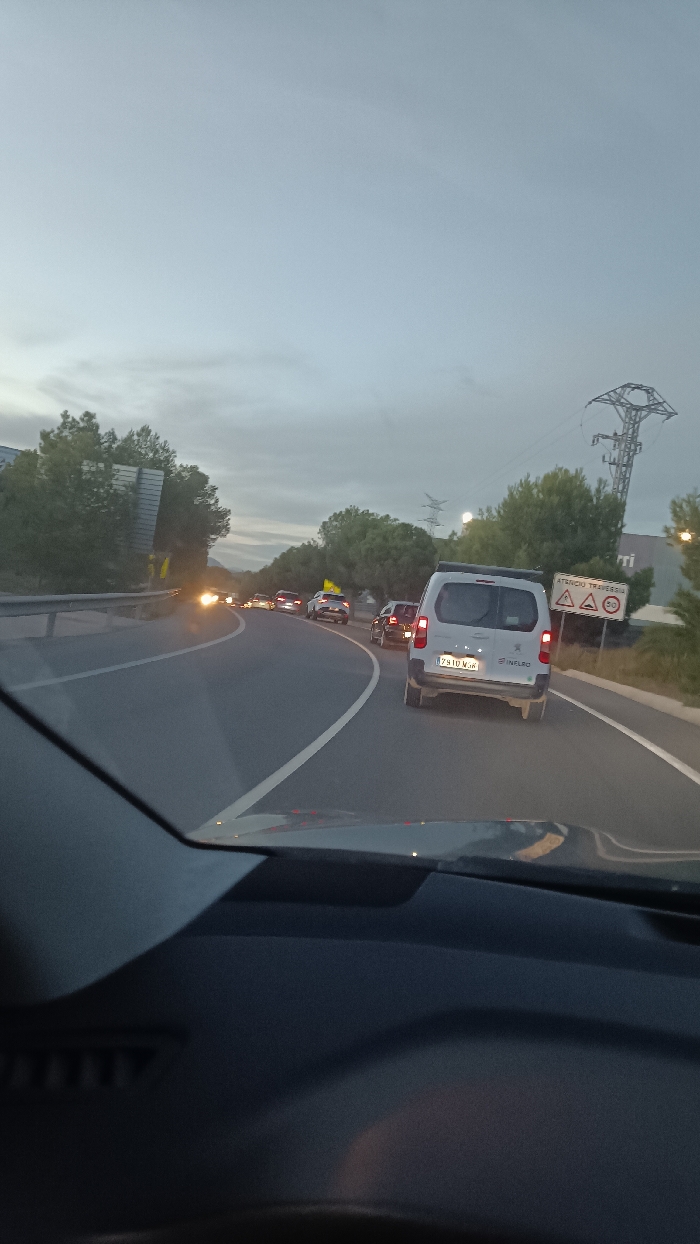 The image depicts a vehicular perspective from a dashboard, looking forward at a multi-lane road experiencing moderate to heavy traffic congestion. The scene is set under an overcast, light grey sky, indicative of dusk or dawn. In the immediate foreground, the dark grey dashboard and the lower edge of a windshield are visible. The road ahead features two clearly marked lanes with white solid and broken lines. A line of vehicles occupies both visible lanes, with brake lights illuminated. The most prominent vehicle in the right lane is a light grey van, possibly a Peugeot Partner, with a Spanish license plate "7910 MGR" and the word "INELRO" visible on its rear. This van is equipped with an orange roof rack. Behind it, other vehicles, including a dark sedan and a white SUV, are queued. Headlights from vehicles further down the road or in opposing traffic are visible as bright points of light. To the left of the road, a metal guardrail runs alongside a treeline. To the right, trees and bushes line the roadside. A tall metal power line tower stands prominently in the background on the right. Immediately beside the right lane, a white rectangular road sign with Spanish text "ATENCIÓN TRAVESÍA" (Attention Thoroughfare) displays three warning symbols: two speed bumps, a triangular general warning, and a circular speed limit sign indicating 50 km/h. The location is a roadway within or approaching the city of Sagunto, Spain, characterized by industrial or peri-urban infrastructure, including power lines and what appears to be a large building structure partially visible beyond the trees on the right.
