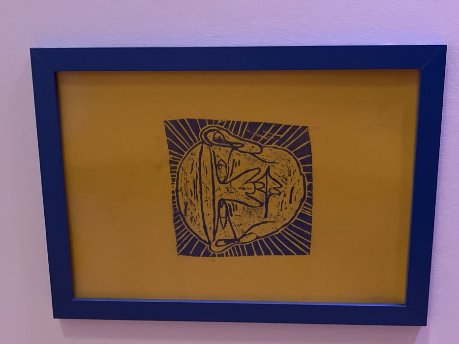 A framed, vertically oriented linocut print hangs on a light-colored wall in Krasnoyarsk, Russia
