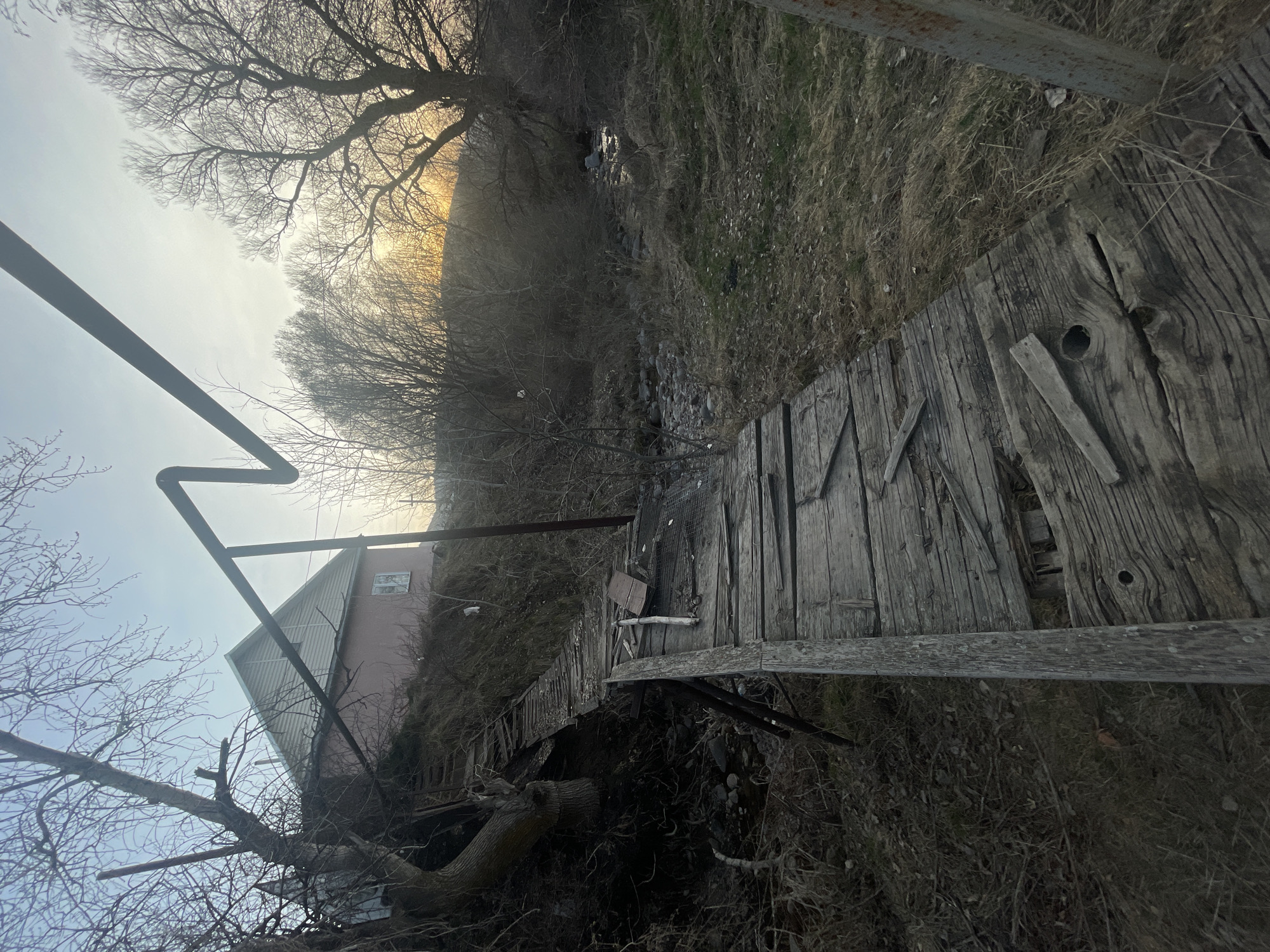 dilapidated wooden footbridge in a natural setting, possibly in Алмалык, Kazakhstan