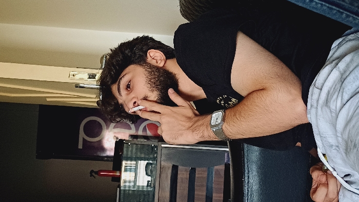 The image depicts an indoor scene within Rukn ad-Din Municipality, Syria. A male subject, appearing to be in his mid-twenties with dark, curly hair and a beard, is seated. He wears a black short-sleeved t-shirt, light-colored fabric draped over his lap, and blue jeans are partially visible on the right. A square-faced wristwatch with a metallic strap is worn on his left wrist. The subject is holding a lit cigarette between the index and middle fingers of his left hand, positioned near his mouth, and looking upwards and to his right. In the background on the left, dark-toned furniture with reflective glass panels displays a blurred reflection of an outdoor urban environment. A red spray bottle rests on this furniture. A vertical dark purple sign featuring a large white stylized 'p' or 'P' is visible behind the subject's left shoulder, adjacent to a light-colored wall.