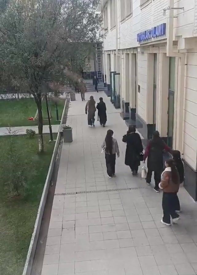 sidewalk scene with a building on the right side and a grassy area with trees on the left. Several people are walking along the sidewalk in the same direction. The building has a sign written in a language other than English. Some of the people are wearing dark clothing. There are lampposts along the sidewalk. The sidewalk is made of light-colored square tiles. A ladder is visible along the building.