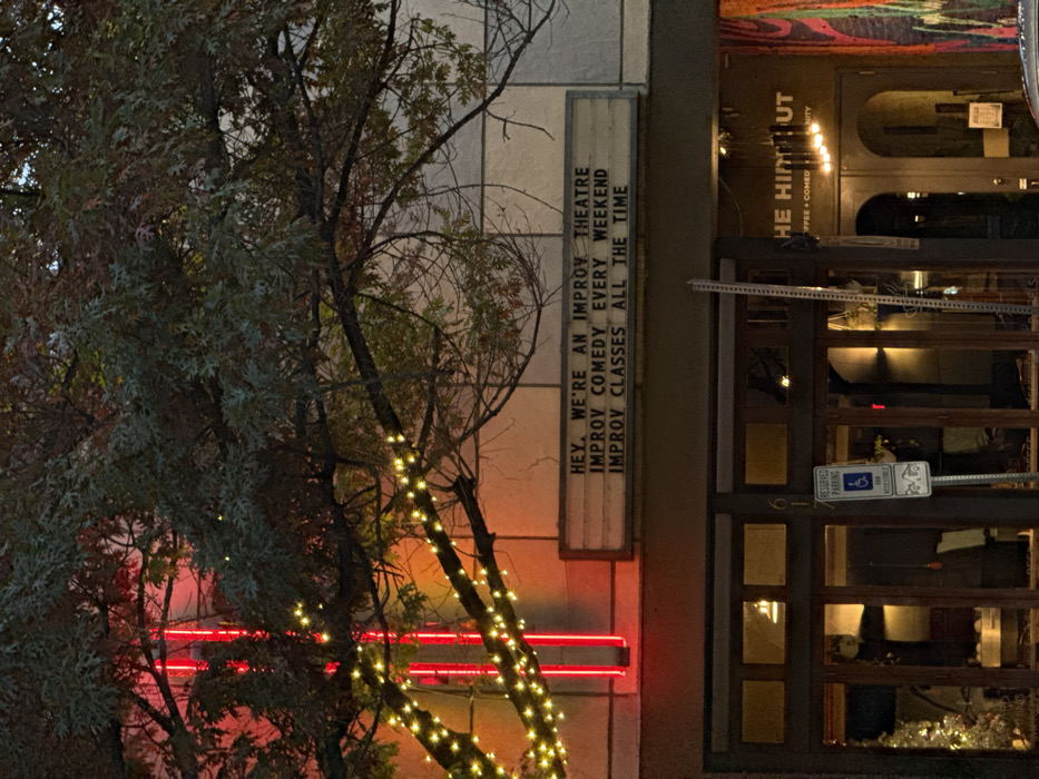 The image features an improv theater, "The Hideout," with a vertical marquee advertising improv comedy every weekend and classes offered continuously. A tree with small lights is prominently displayed in front. A neon red light and a handicap parking sign are visible near the entrance. The building's facade is a mix of materials, including windows, with lights illuminating the interior.