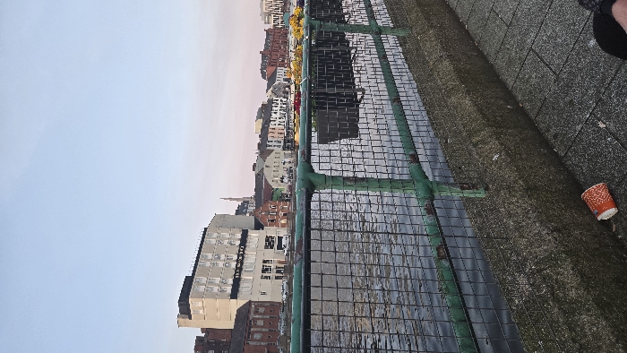 The image captures a static scene along the River Lee in Cork City, Ireland, viewed from the north bank, likely St. Patrick's Quay, looking southwest towards the south bank. In the immediate foreground, a weathered green metal mesh fence with visible rust runs horizontally across the lower middle of the frame, separating the viewer from the river. Directly beneath the fence is a concrete retaining wall. On the paved ground beside this wall, in the lower left quadrant, a single crumpled orange and white paper cup lies on its side. A dark, indistinct object, possibly footwear, along with a glimpse of pale skin, is visible in the bottom right corner of the frame. The midground features the dark, rippled surface of the River Lee, flowing behind the fence. Several dark, rectangular planter boxes are affixed to the fence structure, positioned above the water. The background displays a collection of urban buildings lining the opposite riverbank. A large, multi-story building, light-colored with numerous rectangular windows and black architectural details, is prominent on the left, bearing the visible signage "THE DEAN." To its right, a spire, consistent with St. Fin Barre's Cathedral, rises above the rooftops of a series of older, predominantly brick and pastel-colored buildings. Further along the bank to the right, patches of yellow foliage are visible, suggesting trees. The sky above is a clear pale blue, transitioning to a light pinkish hue near the horizon. No individuals are clearly identifiable, nor are any actions or interactions depicted beyond the apparent discarded cup.