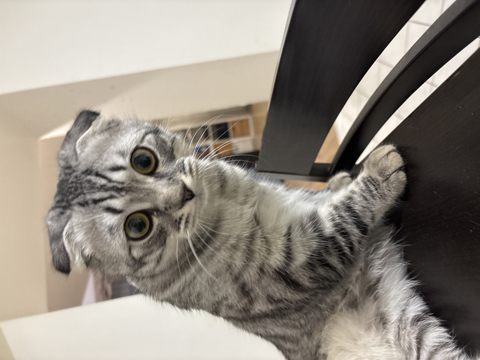 - "A gray and white tabby cat with folded ears is clinging to the side of a dark brown chair" by FM-xlahD2, licensed under CC BY 4.0