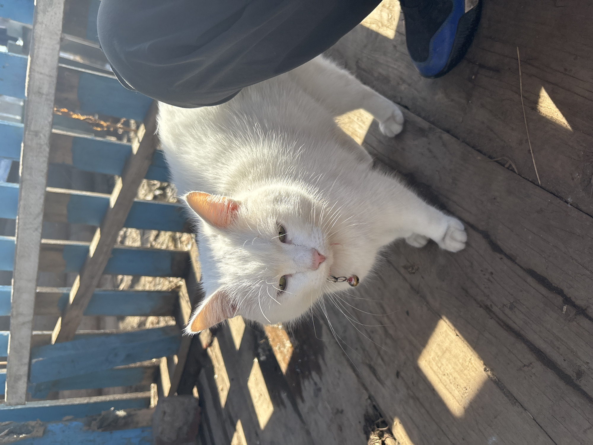 A white cat with a bell collar is on a wooden porch or deck, near a set of blue-painted stairs. The cat is looking up. A person is near the cat, with part of their black pant leg and blue and black shoe visible. The porch is made of wooden planks with gaps between them, letting sunlight through. The location is most likely not in Osa, Russia.