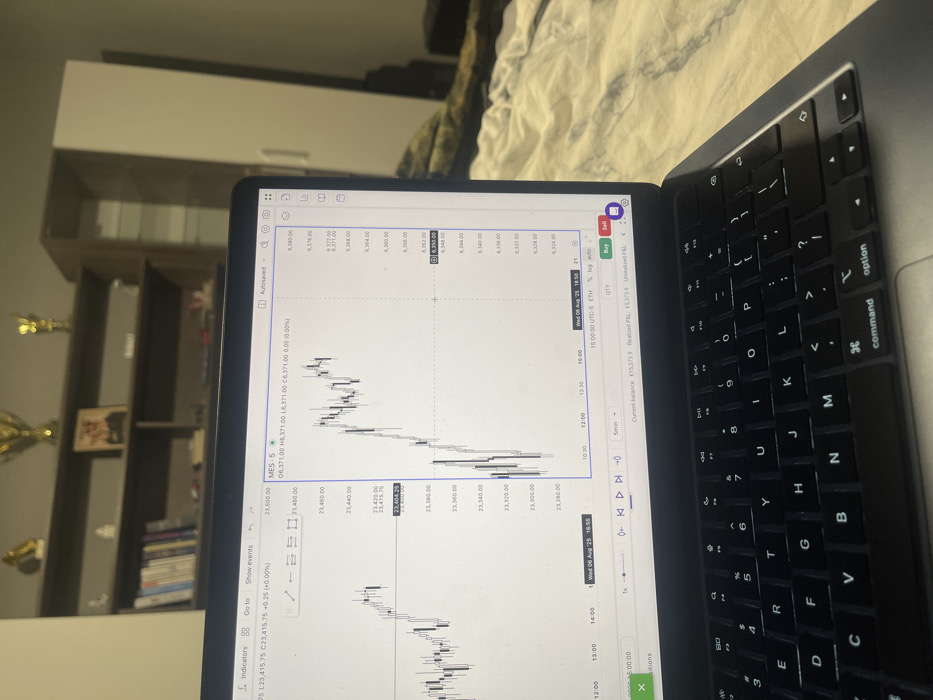 The image depicts an indoor scene in Gorno Sahrane, Bulgaria, focusing on a silver laptop resting on a patterned, light-colored duvet or blanket, suggesting it is on a bed. The laptop screen displays financial charting software, featuring two candlestick charts with price scales (e.g., 23,280 to 23,600 and 6,324 to 6,390) and timestamps indicating "Wed 06 Aug 22 18:55" and "Wed 06 Aug 22 18:50". A "Current balance: 15,373.9" and "Realized P/L: 5,373.9" are visible at the bottom of the screen, alongside "Buy" and "Sell" buttons. The asset "MES 5" and potentially "ETH" are displayed with a "15:00 UTC-5" timestamp. The laptop's keyboard is black. In the background, a dark wooden shelving unit holds several books, two gold-colored trophies, and a framed photograph of two individuals. To the right of the shelving unit, a light-colored, two-door wardrobe is partially visible. No people are present, and no active interactions are depicted.
