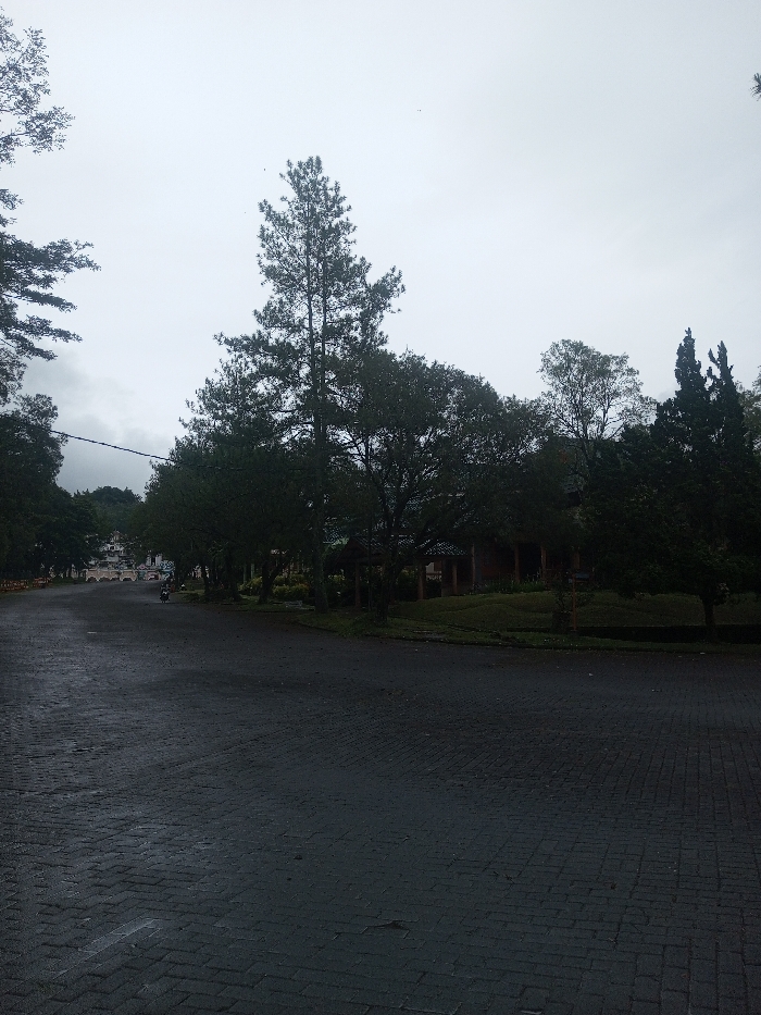 This forensic description details an overcast outdoor scene in Babaliya Mal., India. The foreground consists of dark, wet-appearing paving stones, consistent with brick or cobblestone, that form a wide intersection or plaza. A main paved road extends towards the left into the distance, bordered by dense trees. In the far distance along this road, several light-colored buildings are discernible amidst further foliage. A single individual is observed operating a dark-colored two-wheeled vehicle, heading away from the viewer on the distant road. An overhead utility wire traverses horizontally across the mid-ground. The right side of the image features numerous trees, including a prominent tall conifer. Partially visible behind these trees and manicured grassy mounds is a building with a dark, multi-gabled roof and reddish-brown walls, featuring multiple open archways or windows, indicative of traditional architecture. The sky is uniformly grey and overcast, contributing to the low light conditions across the scene.