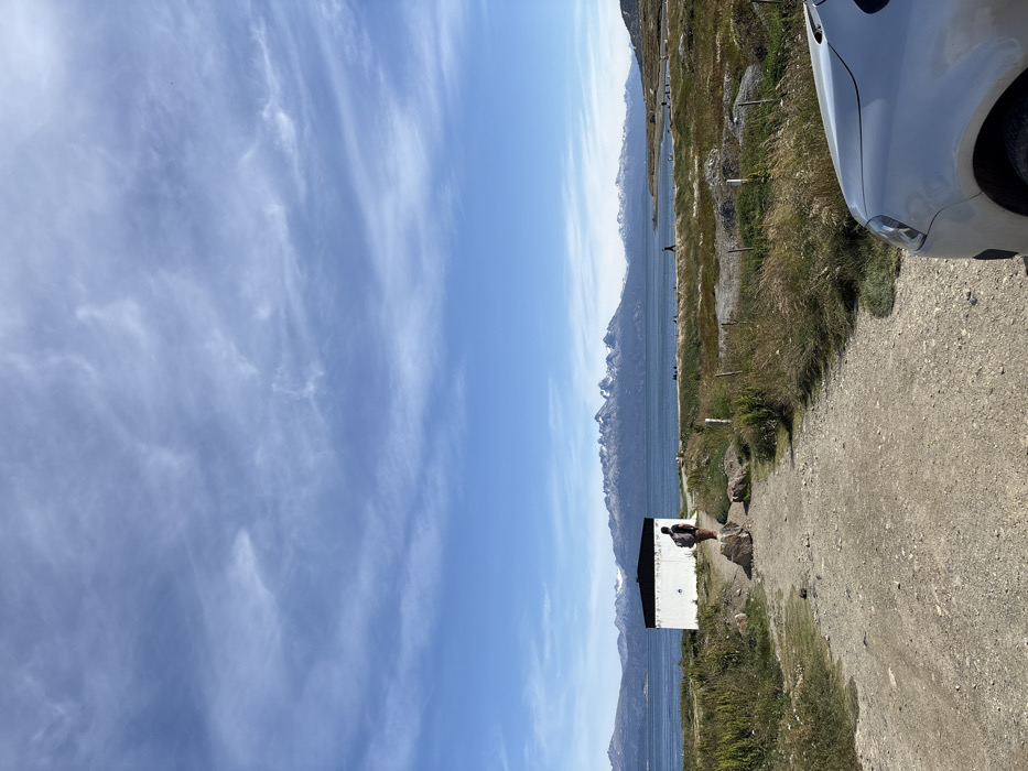 A scenic landscape features a bright blue sky filled with wispy clouds, meeting snow-capped mountains and a body of water. A white building sits near the water's edge, with a person standing nearby. In the foreground, a gravel path runs parallel to a grassy area, with the partial view of a white car on the right edge of the image. The picture is taken from a slightly elevated position, capturing a wide perspective of the mountainous terrain and sky.