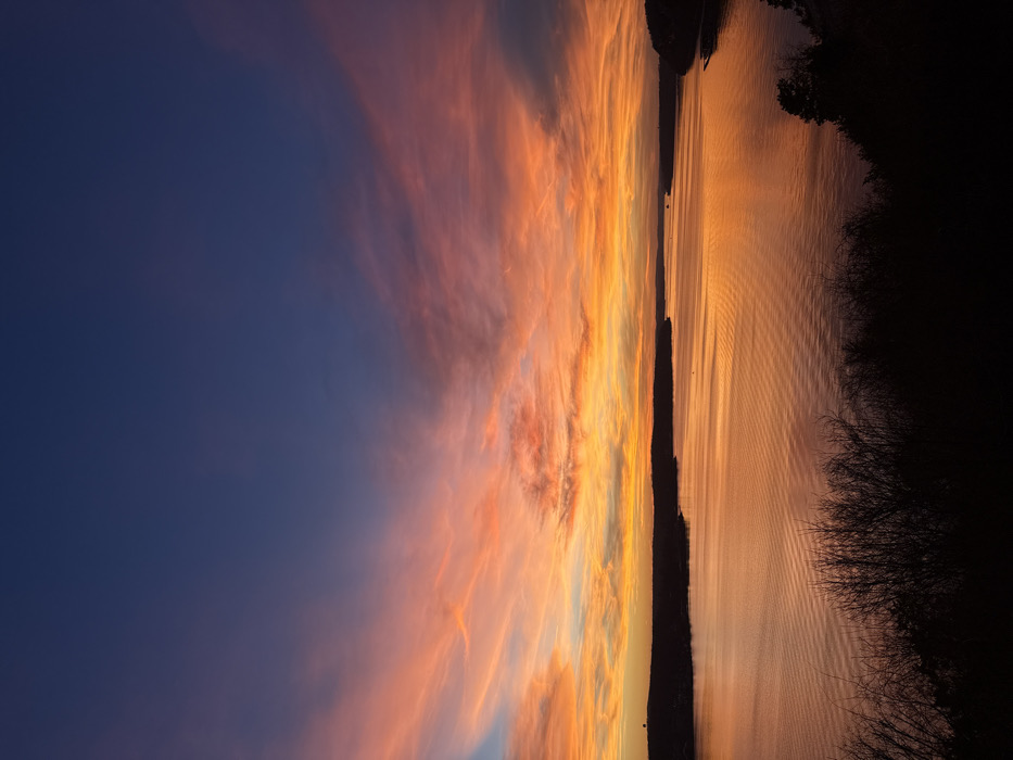 A captivating sunset scene displays a vivid orange sky blending with the dark blue of twilight. Reflected on the calm water below, the colors create a mirrored effect, enhancing the brilliance of the sunset. A dark strip of land divides the sky and water. Dense foliage adds a silhouetted border to the right side of the view, emphasizing the horizon and deepening the contrast.
