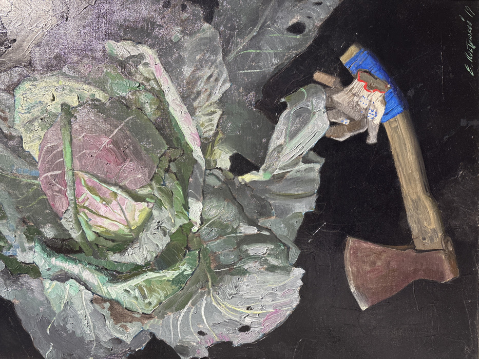 This image is an oil painting on canvas, depicting a still life composition. **Location:** The scene is an indeterminate indoor setting, likely a studio, and provides no visual information to specify a location within the city of Voronezh, Russia. **Subjects and Objects:** The upper two-thirds of the canvas are occupied by a large head of cabbage. Its outer leaves are rendered in shades of grey-green with hints of white and pale pink, displaying visible texture, some surface irregularities, and small perforations. The central core of the cabbage exhibits a distinct pinkish-purple coloration. In the lower section of the painting, an axe and a work glove are arranged on a dark, unadorned background. The axe is positioned diagonally, with its reddish-brown metal head facing towards the lower left and its light-brown wooden handle extending towards the lower-center right. Adjacent to the axe handle, a crumpled or folded light-colored work glove, featuring a prominent blue wrist cuff and subtle red markings, is depicted. **People, Actions, Interactions:** No human figures are present. The scene is static, depicting an arrangement of inanimate objects without any explicit actions or interactions. **Environment:** The background is uniformly dark, almost black, which serves to emphasize the foreground subjects. The entire painting is characterized by a heavy impasto technique, evident in the thick, textured brushstrokes across all elements. A signature, "Е. Кастриков 19" (E. Kastrikov '19), is visible in the lower right corner, indicating the artist and the year 2019.
