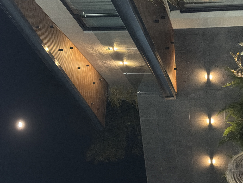 building exterior at night. Warm light emanates from wall fixtures, contrasting with the dark sky where a crescent moon is visible. Modern architectural elements include a glass roof, wooden paneling, and concrete surfaces. The corner of the building is framed by dark vegetation. Overall, it's a blend of contemporary design and natural elements under nocturnal lighting.