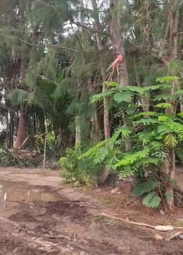 The video depicts a dirt ground with puddles of water, surrounded by various trees and plants. There are tall, thin trees with green needles, palm trees, and a small green leafy plant in the foreground. A pink ribbon or marker is tied to one of the trees. The ground is muddy and disturbed, with visible footprints. The scene appears to be a wooded area near a beach or clearing, possibly after rainfall.