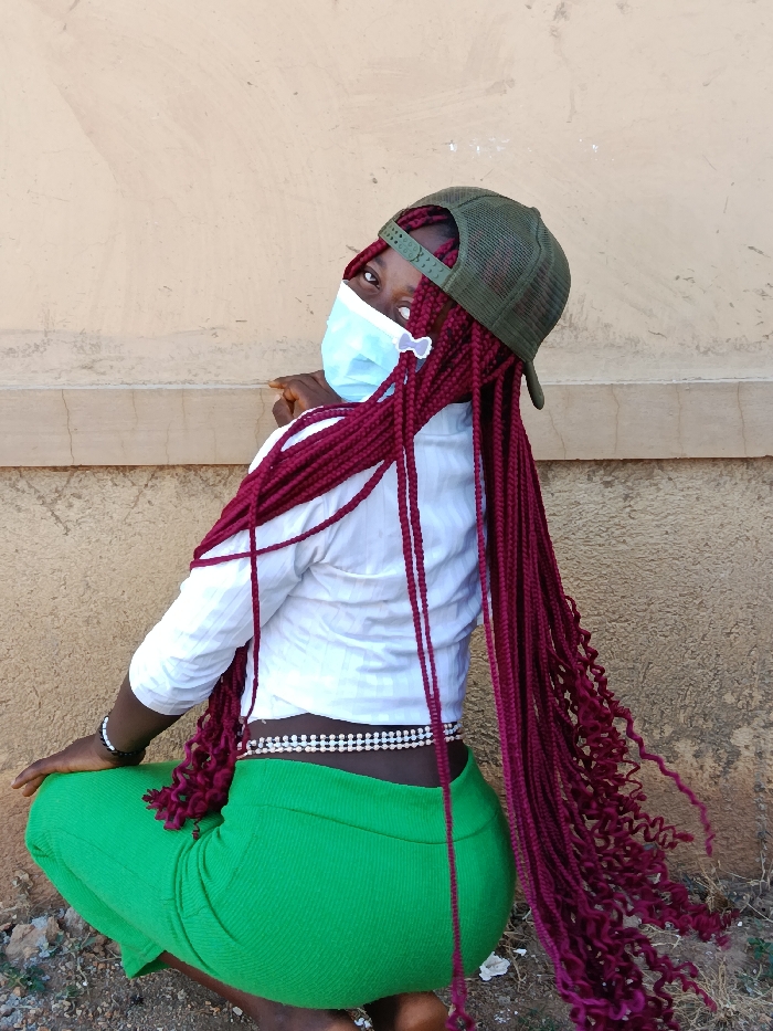 A dark-skinned individual is depicted crouching outdoors in Dong, Nigeria. The subject is turned slightly away but looks over their left shoulder towards the camera. They wear a light blue disposable surgical mask, obscuring the lower half of the face, with a small white bow attached to the visible left mask strap. An olive green mesh-back baseball cap is worn backward on their head. Long, red/burgundy box braids extend past the shoulders and lower back, with some ends appearing curly. The individual wears a white, long-sleeved shirt with subtle vertical stripes, its sleeves pushed up to the forearms. Two strands of light-colored beaded waist chains are visible around the lower back, above a tight-fitting, ribbed green skirt or capri-style garment. A dark beaded bracelet is present on the left wrist. The individual is barefoot. The background consists of a plain, light tan wall with a horizontal ledge running across its lower section. The ground directly beneath and in front of the subject is dry, dusty earth mixed with small stones and debris.